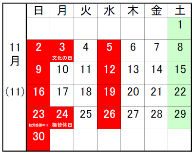 ※11月は3日(月)、24日(月)が祝日でお休みです。